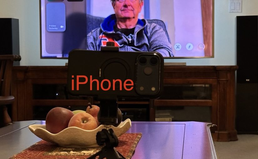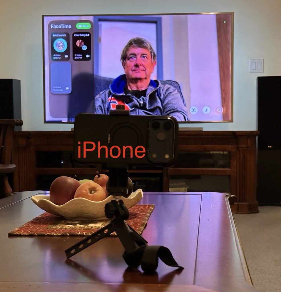 Once you have your phone mounted, you’re ready to FaceTime. Below is what it looks like in a FaceTime call. Since my chair is pretty far from the TV, I placed the iPhone camera on a table closer to me to capture a better image.