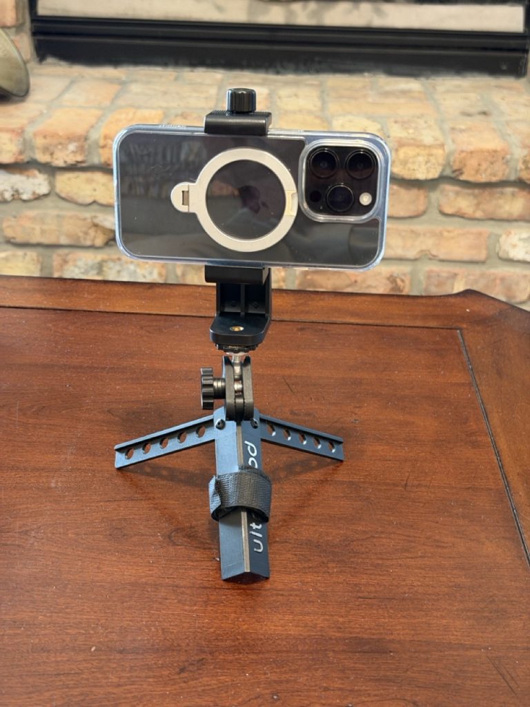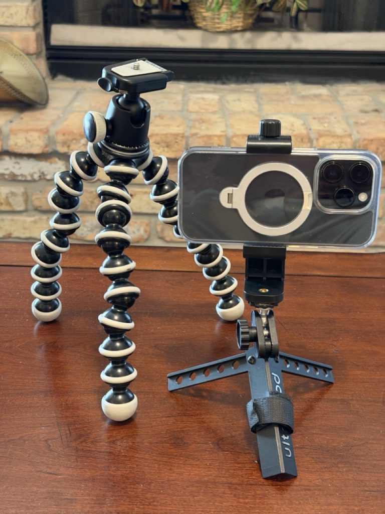 Below is my phone mount on a mini tripod. The tripod had a ball-swivel head, which is what you want to get the camera pointed in the correct direction. This product on Amazon seems to be a very similar setup.